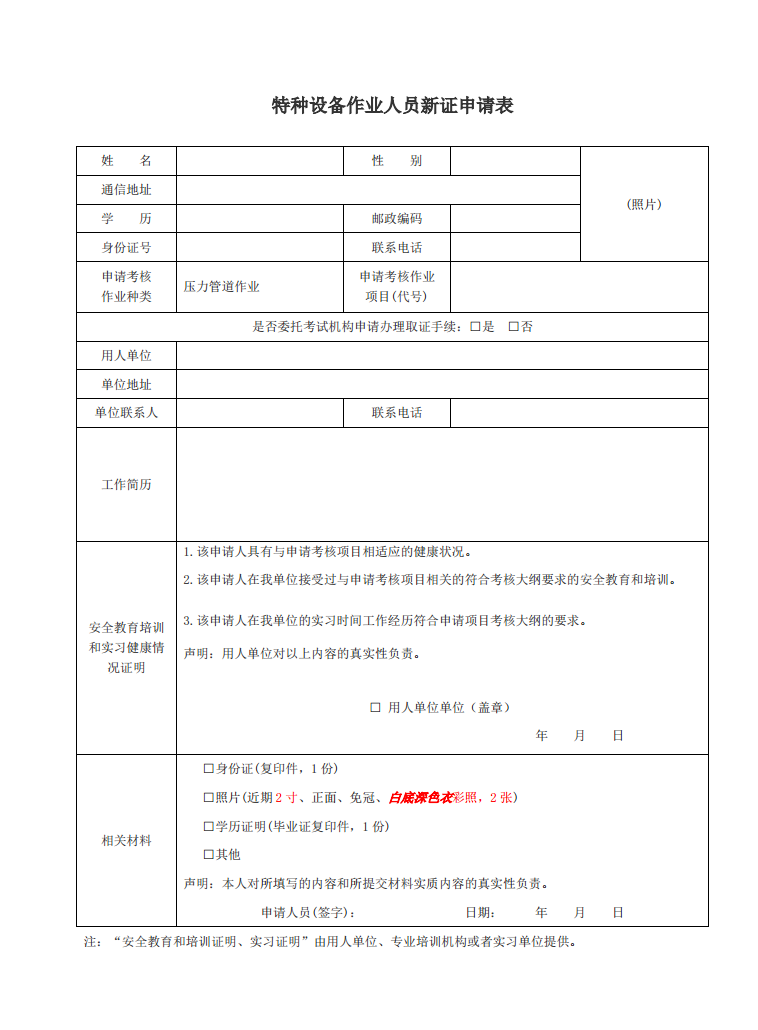 1、参加培训人员如实填写特种设备作业考试申请表1份;